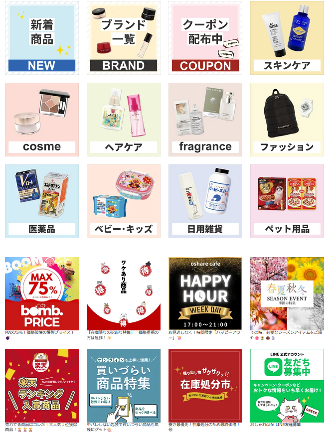 コスメ・スキンケア・化粧品・スキンケア・香水・美容家電・サプリメント・食品・医薬品・日用品・ファッション・キッズ・ベビー・おもちゃ・ペット用品・家具・自転車