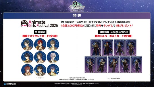 キャラクターグッズの商品企画・製作・販売を行う中外鉱業株式会社コンテンツ部は、2025年11月8日(土)~11月9日(日)開催の「アニメイトガールズフェスティバル 2025」にて『文豪とアルケミスト』の新商品を販売します。