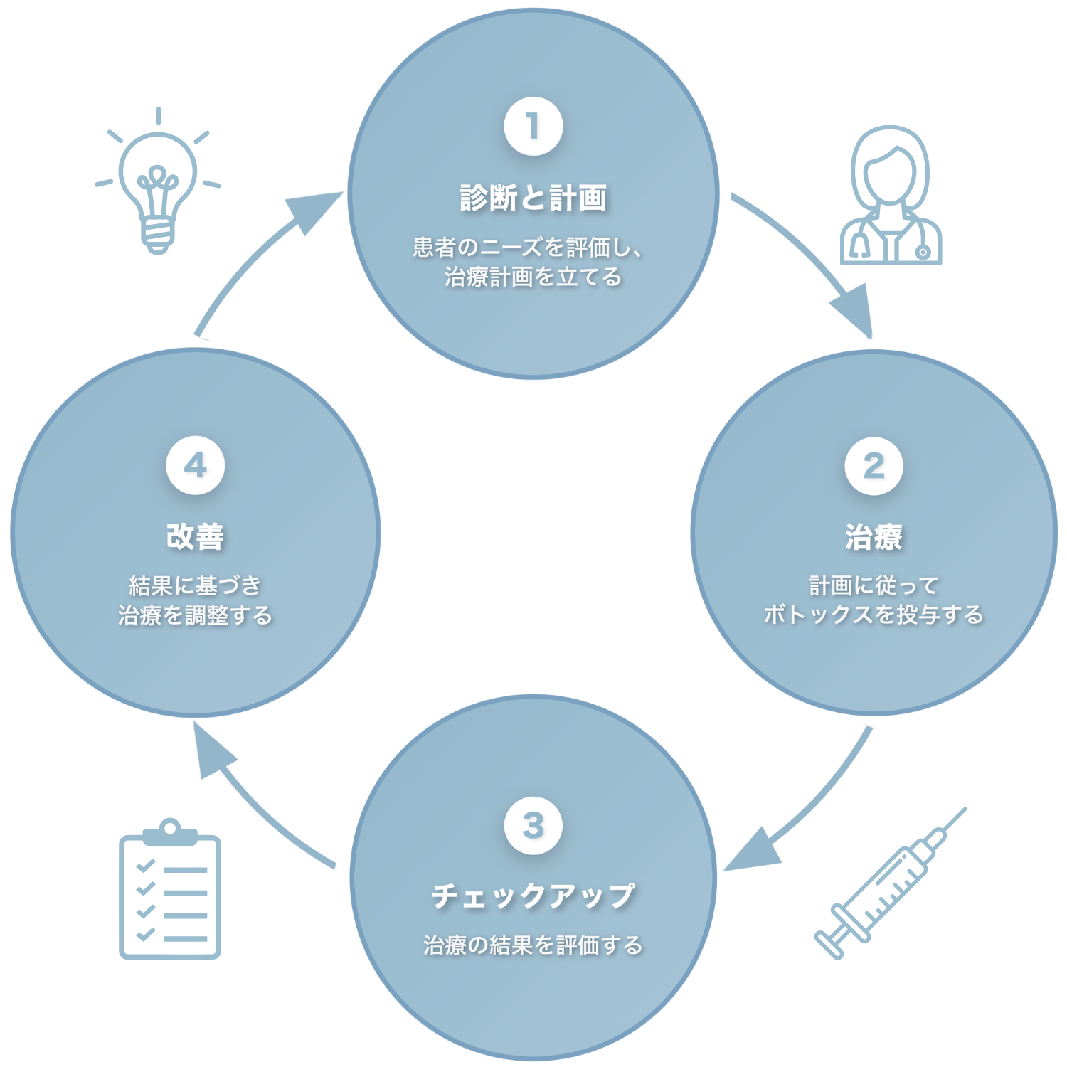 ビジネスでも重要とされるPDCA(計画→実行→評価→改善)と同じように、術後の評価、そしてその評価に基づき改善・最適化する。これが当院のボトックス治療の強みです。
