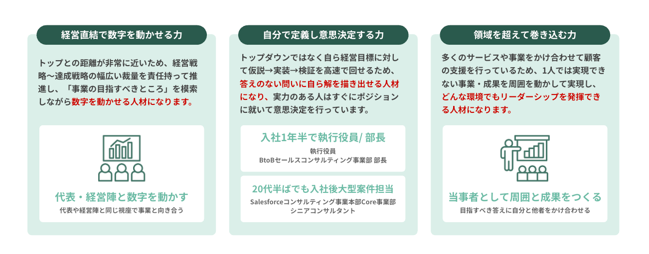 小規模チームで高い裁量を持ち、顧客の売上・粗利・再現性といった実経営KPIで価値を測る実戦環境を、若手にこそ開放します。