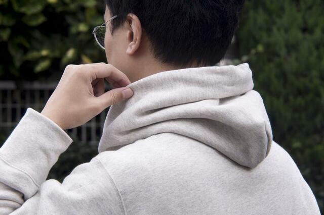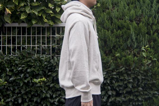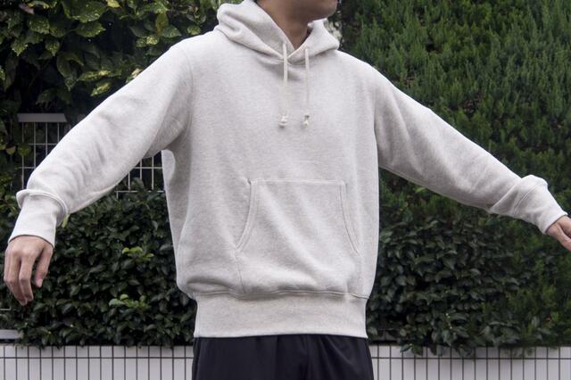 スウェットパーカーのシルエットで個人的に重視したいフードのボリューム感。