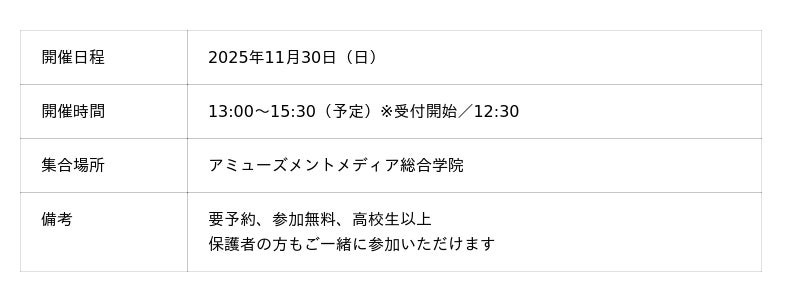 さらに、「エンタメ業界に興味はあるけれど、希望の職種や学科が決まらない」という方へ向けた「AMG学校説明会」も開催。業界全体のお話を交えながら、AMGで学べることやエンタメのお仕事の魅力について学院スタッフが詳しく説明させていただきます。