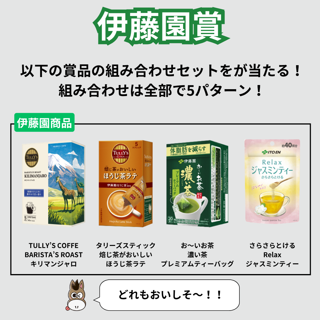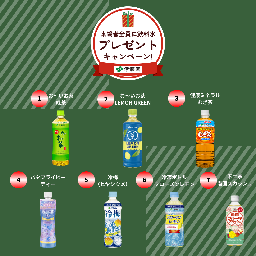 来場者全員に飲料水プレゼント!お~いお茶をはじめ健康ミネラル麦茶など伊藤園商品7種類の中から、お好きな飲料水を1本