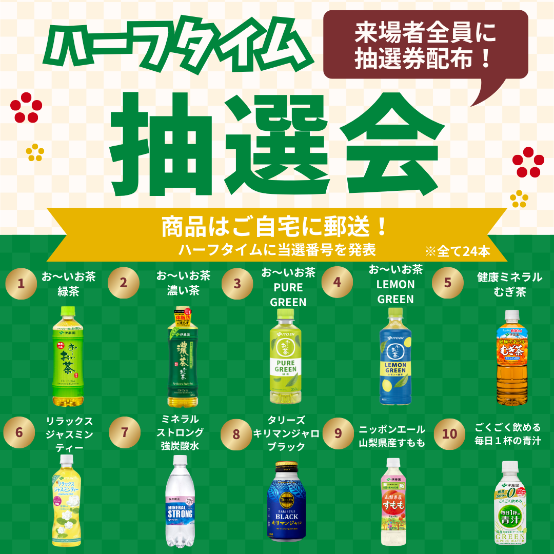 伊藤園商品が当たるハーフタイム抽選会!入場時に抽選券をお配りし、抽選で10名様に伊藤園商品が当たる抽選会を実施いたします。当選者にはお好きな飲料水を1ケース分プレゼントいたします(後日、ご自宅まで無料で配送)。当選番号はハーフタイムで発表予定です。