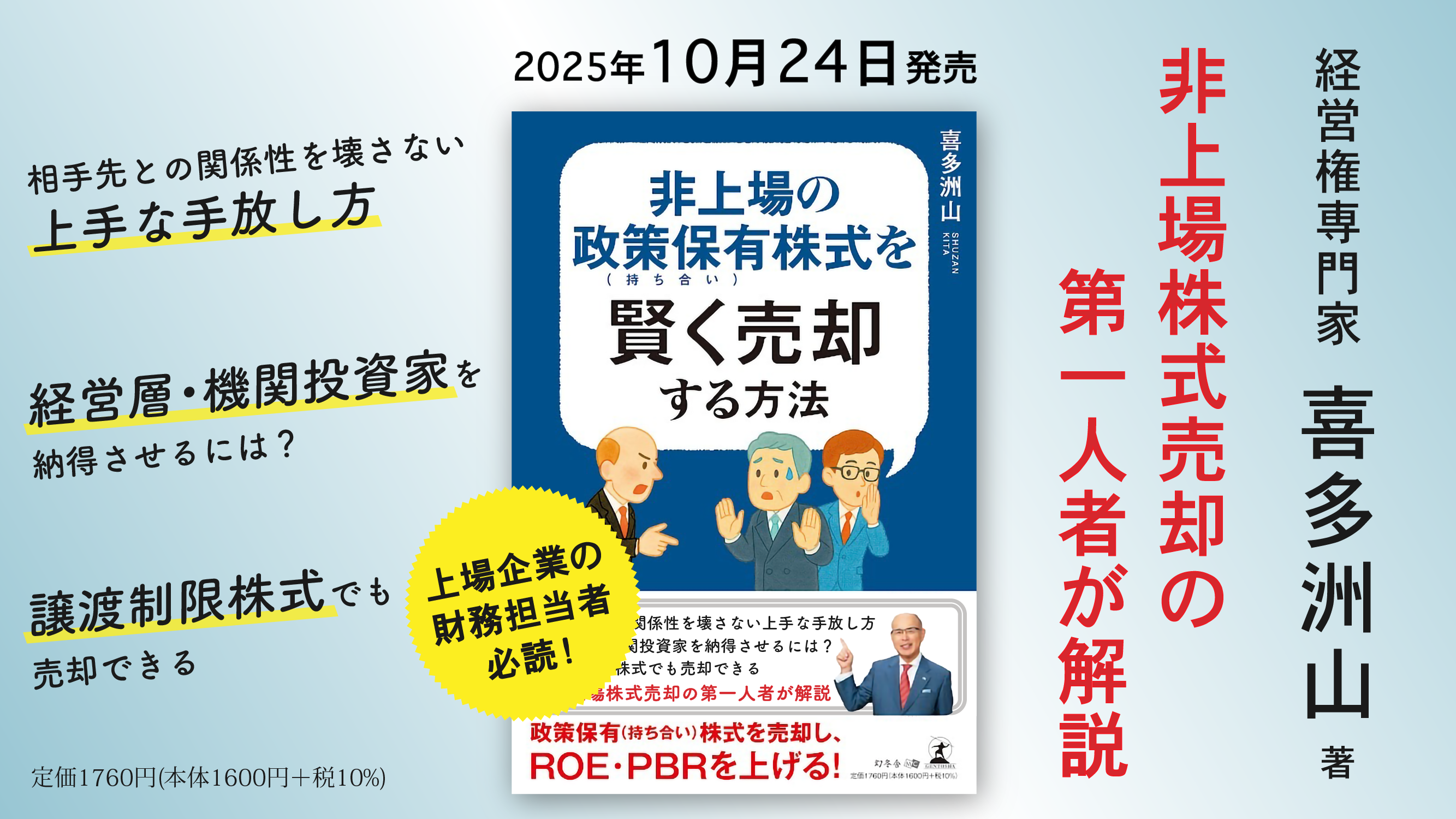 経営権専門家として、分散した株式の集約や非上場株式の買い取りを得意とする、事業承継・経営権のコンサルティングを提供する 株式会社喜望大地(本社:大阪市北区)の喜多洲山は、この度非上場の眠っている政策保有株式を“活かす”ためのメソッドを解説したビジネス書『非上場の政策保有(持ち合い)株式を賢く売却する方法』を2025年10月24日に幻冬舎より出版します。