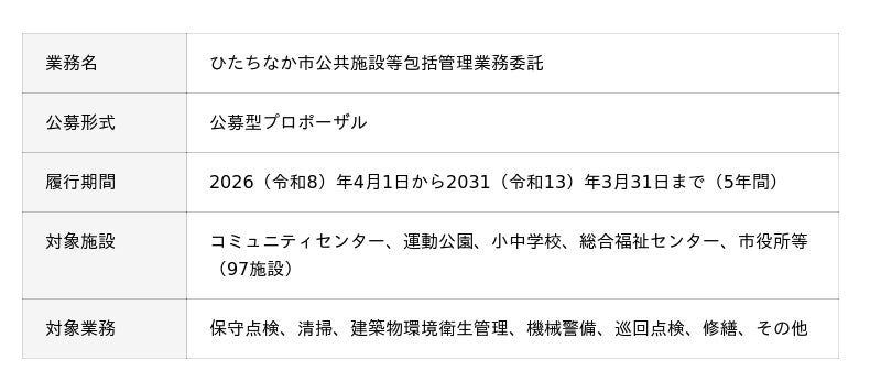 *出典:「ひたちなか市公共施設等包括管理業務委託公募型プロポーザル実施要項」 (ひたちなか市)