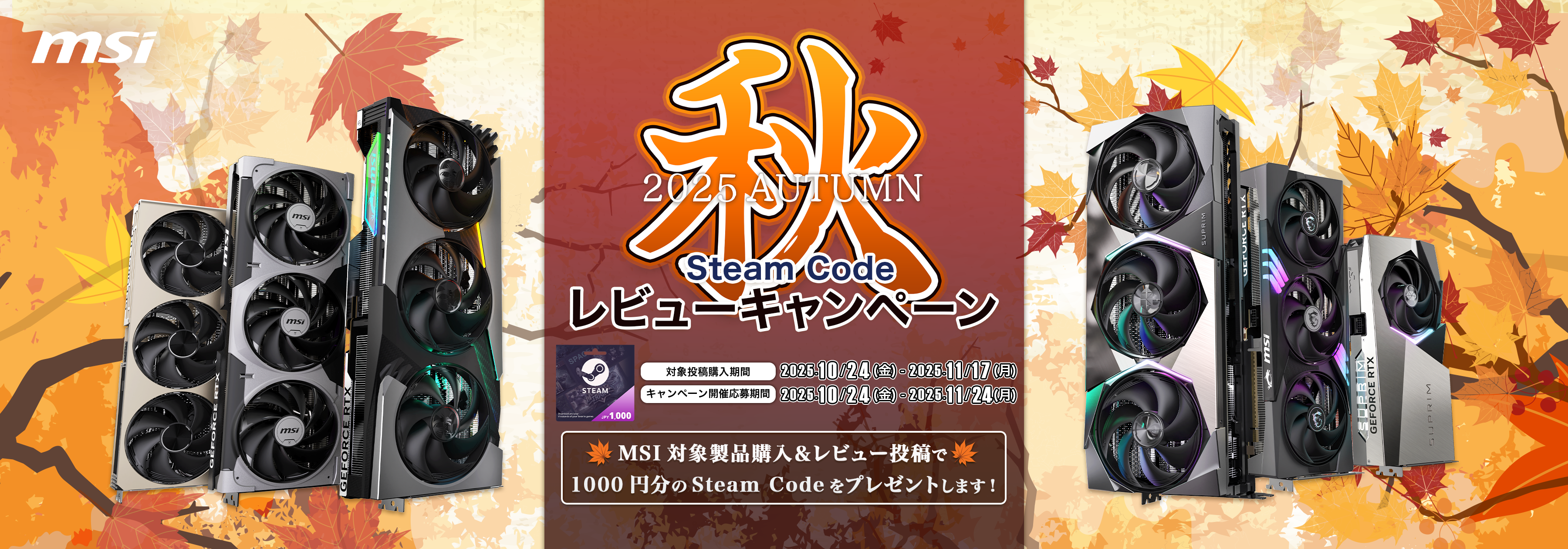 エムエスアイコンピュータージャパン株式会社は、2025年10月24日(金)より対象のMSI製グラフィックスカードを購入し、ECサイトにてレビューを投稿された方に、1,000円分のSteam Codeをプレゼントする「2025年 秋のレビューキャンペーン」を開催いたします。
