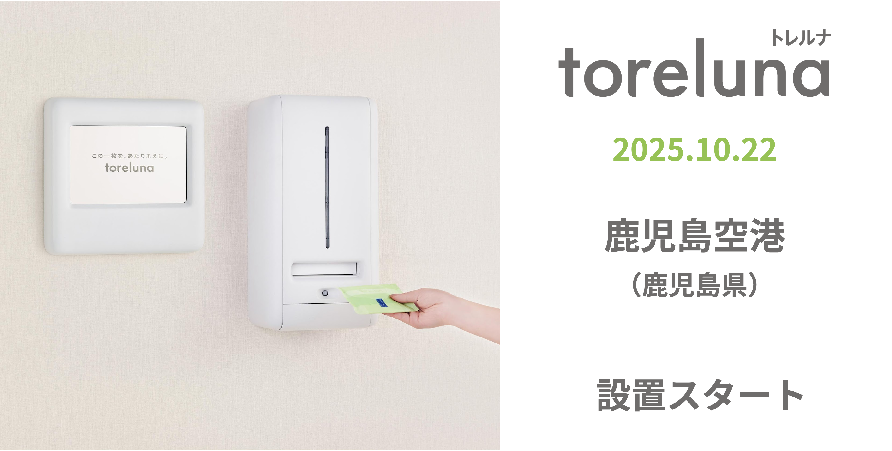 株式会社ネクイノ(大阪市北区、代表:石井 健一)は、トイレの個室で生理用ナプキンを常備し無料で提供するサービス「toreluna(トレルナ)」(以下 トレルナ)を、鹿児島空港国内線ターミナルビルへ設置し、サービスの提供を開始いたしました。これにより、本サービスの鹿児島県内での設置は11箇所目となり、空港での導入は全国で3例目となります。