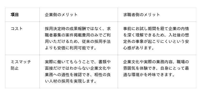 正式採用の前に短期契約で相性を見極め、双方にとっての不幸な早期離職を防止。