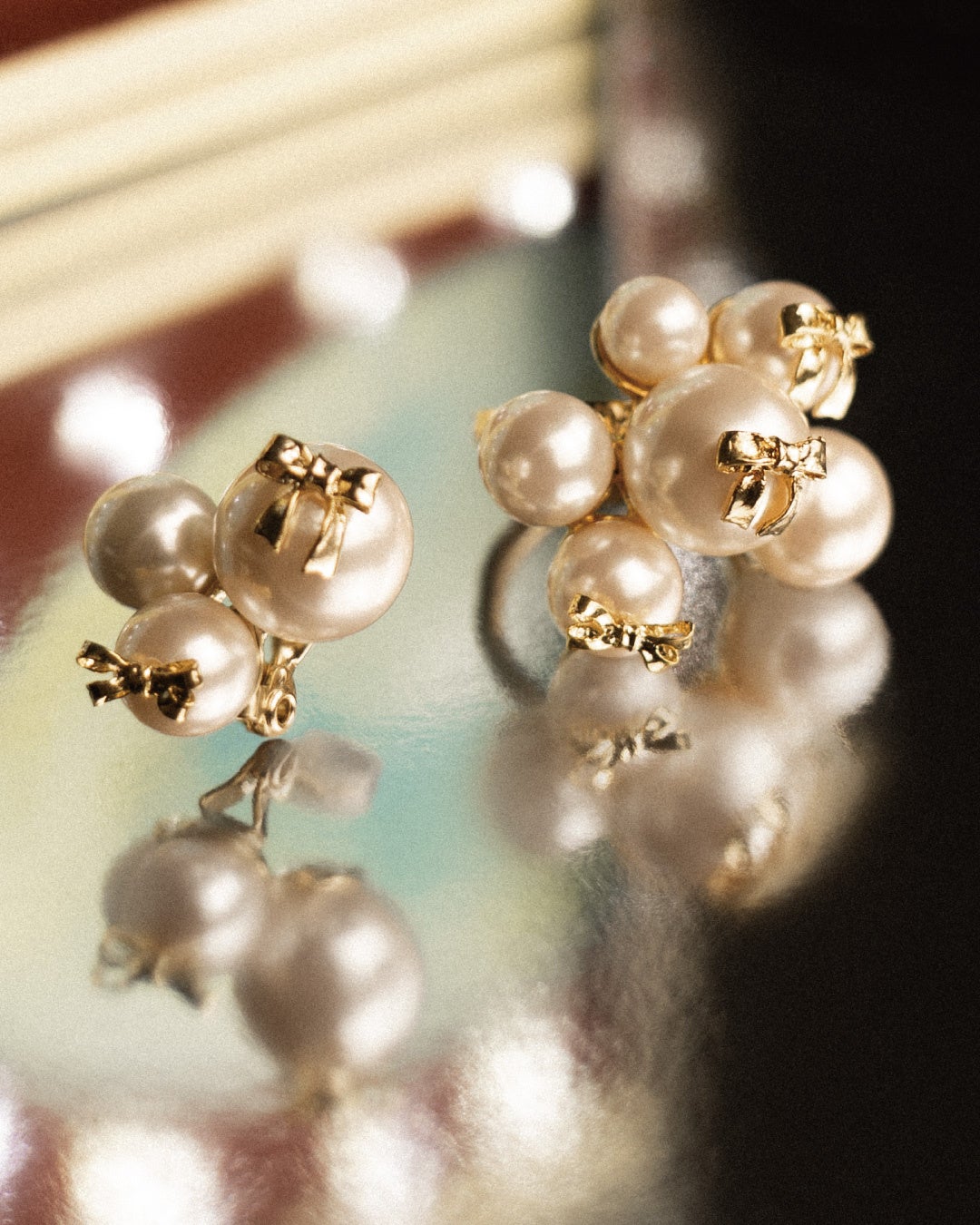 クリスマスツリーのオーナメントからインスピレーションを得た、パールとリボンのコンビネーションがチャーミングなリングやイヤリング。