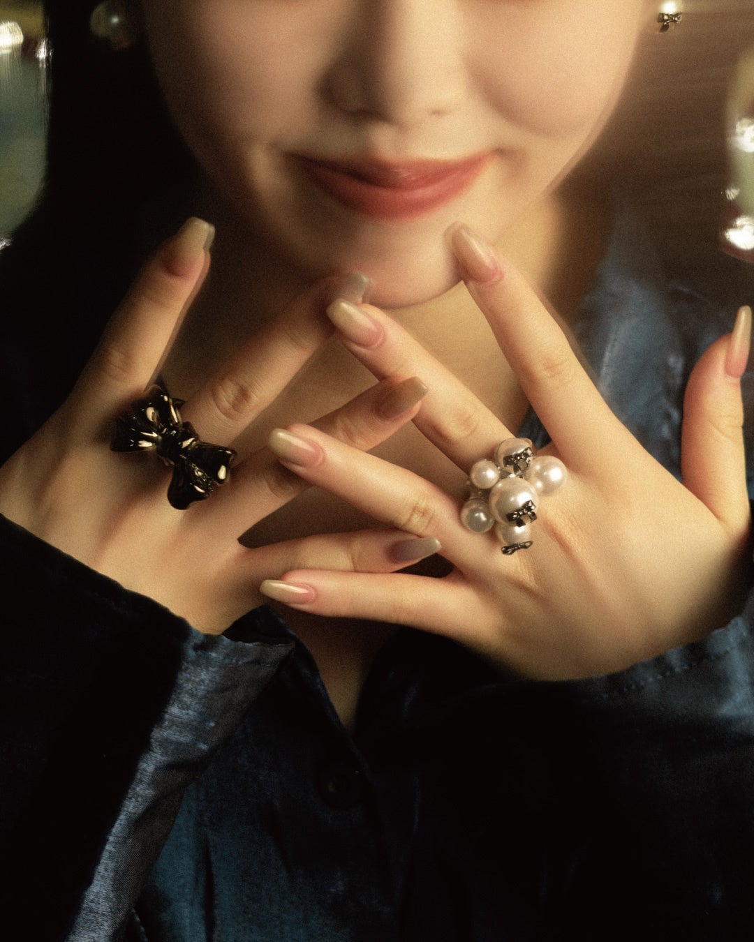 薬指リング※HOLIDAY COLLECTION limitedのため数量限定(ポリエステルレジン、真鍮、パール塗装、メッキ)¥33,000、ピアス※HOLIDAY COLLECTION limitedのため数量限定 ※シングル(ポリエステルレジン、真鍮、プラスチックパール、パール塗装、メッキ)¥27,500