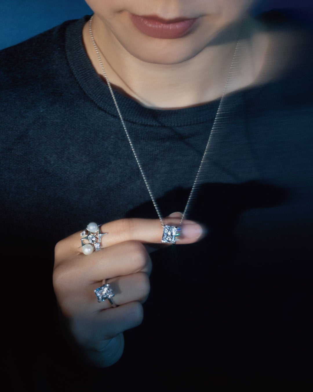 冬のコーディネートを華やかに彩る、オクタゴンカットのキュービックジルコニアが煌めくリングとネックレスも登場。