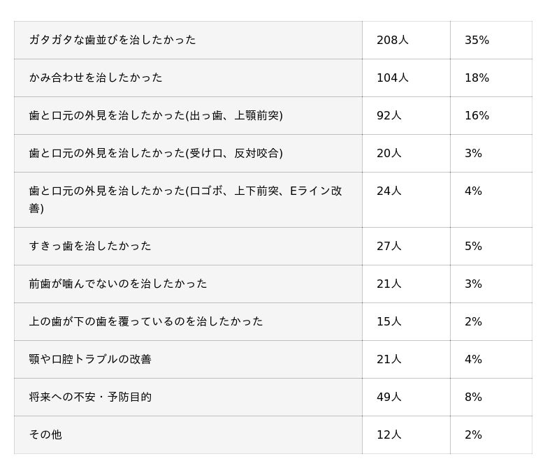 一方で、「噛み合わせ」など機能面の改善を目的とした回答は27%にとどまり、矯正治療を受ける動機としては依然として“見た目の改善”を重視する傾向が強いことが分かりました。