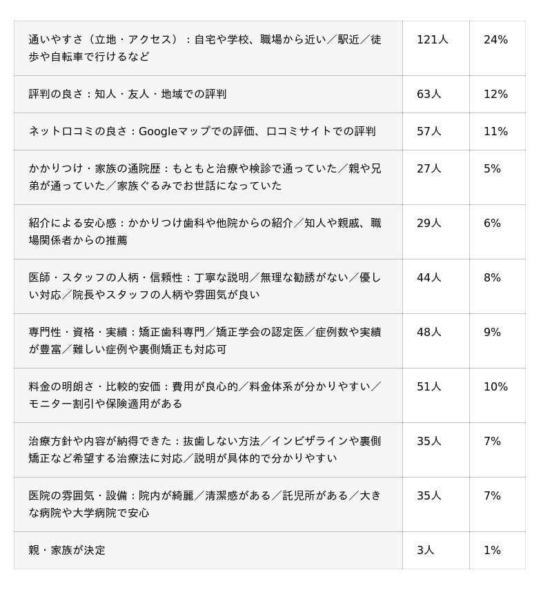質問内容『その歯科医院に通院を決めた理由は?』の結果です。成人矯正に限定して調べました。最も多かったのは「通いやすさ(立地・アクセス)」で全体の24%を占め、日常生活の中で無理なく通える環境が重視されていることがわかります。