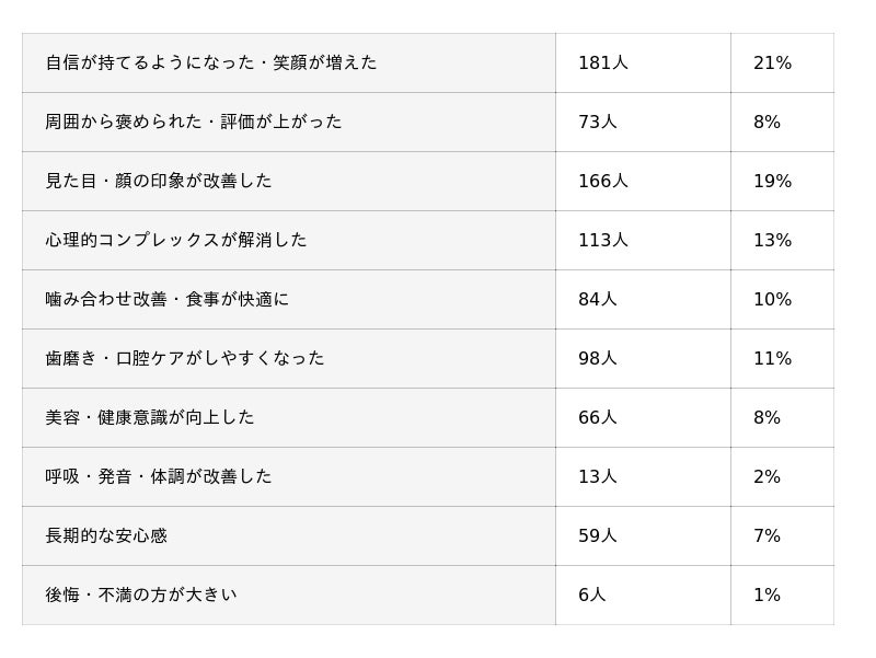次いで「心理的コンプレックスが解消した」と続き、「周囲から褒められた・評価が上がった」もあわせると、審美面・心理面の変化を実感している人がトータル60%以上を占めました。