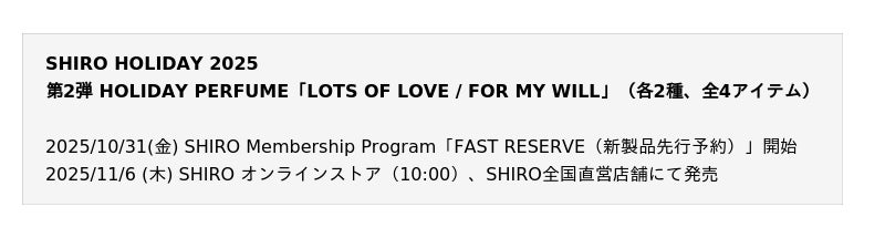 SHIROから皆様へ贈る特別な香りとともに、大切な人と未来への希望に満ち溢れたホリデーシーズンの時間をお過ごしください。