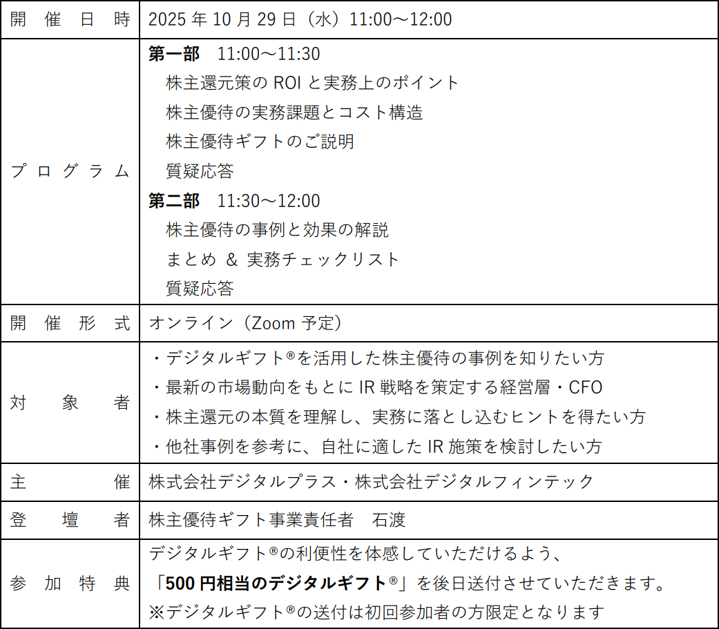 日本企業にとって株主還元策は、投資家との信頼関係を築き、企業価値を高める重要な経営テーマです。 株主優待・配当・自社株買いにはそれぞれ特性があり、特に「株主優待」は日本市場特有の施策として注目されています。しかし、紙商品券やカタログ形式では、印刷・郵送・事務局対応といった隠れたコストが企業に大きな負担となってきました。 本ウェビナーでは、企業実務の視点から「株主優待・配当・自社株買いのコスト/ROI比較」を解説するとともに、デジタルギフト(R)を活用した優待施策の効率化・コスト削減・投資家満足度向上の最新事例をご紹介します。