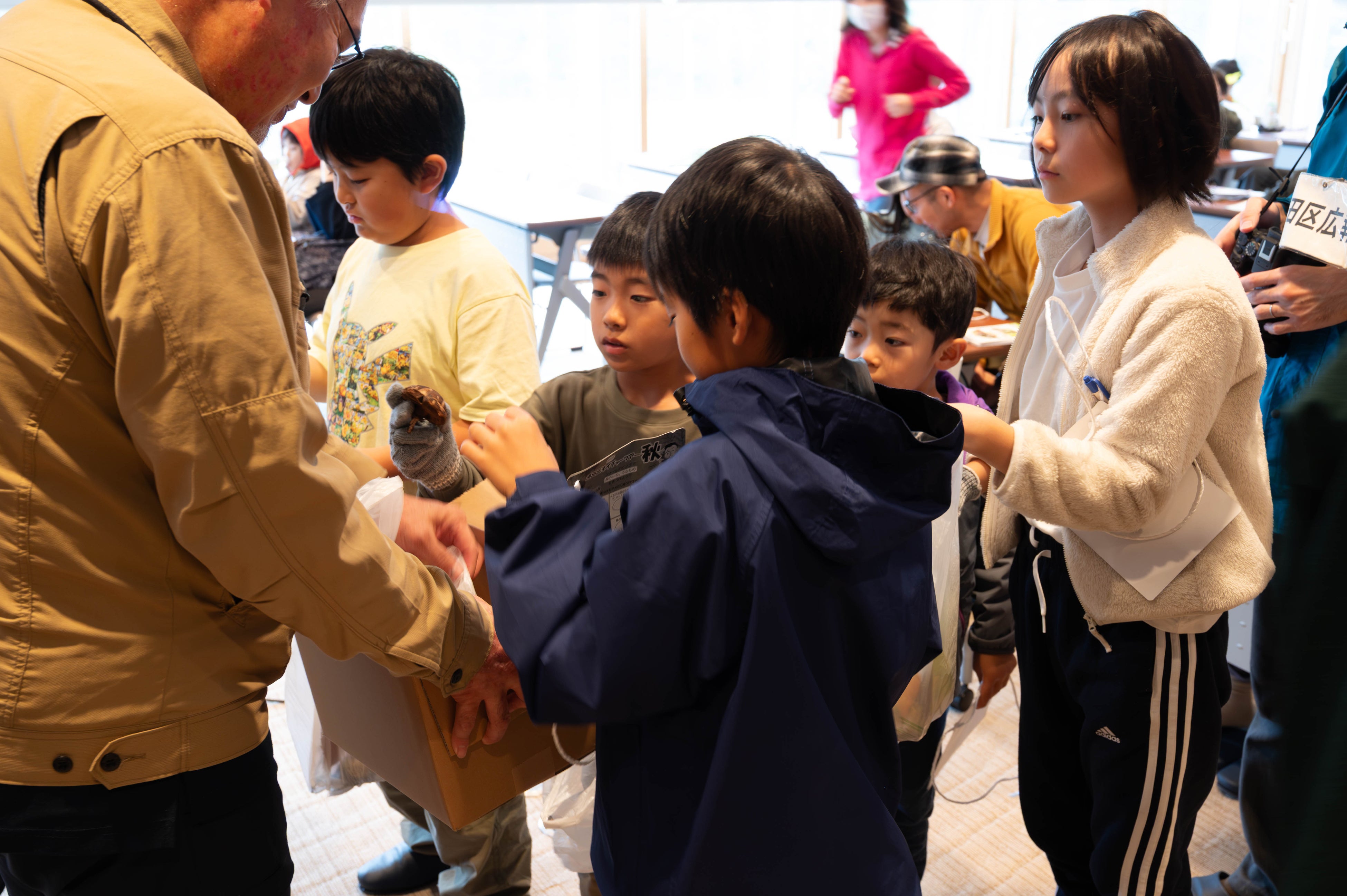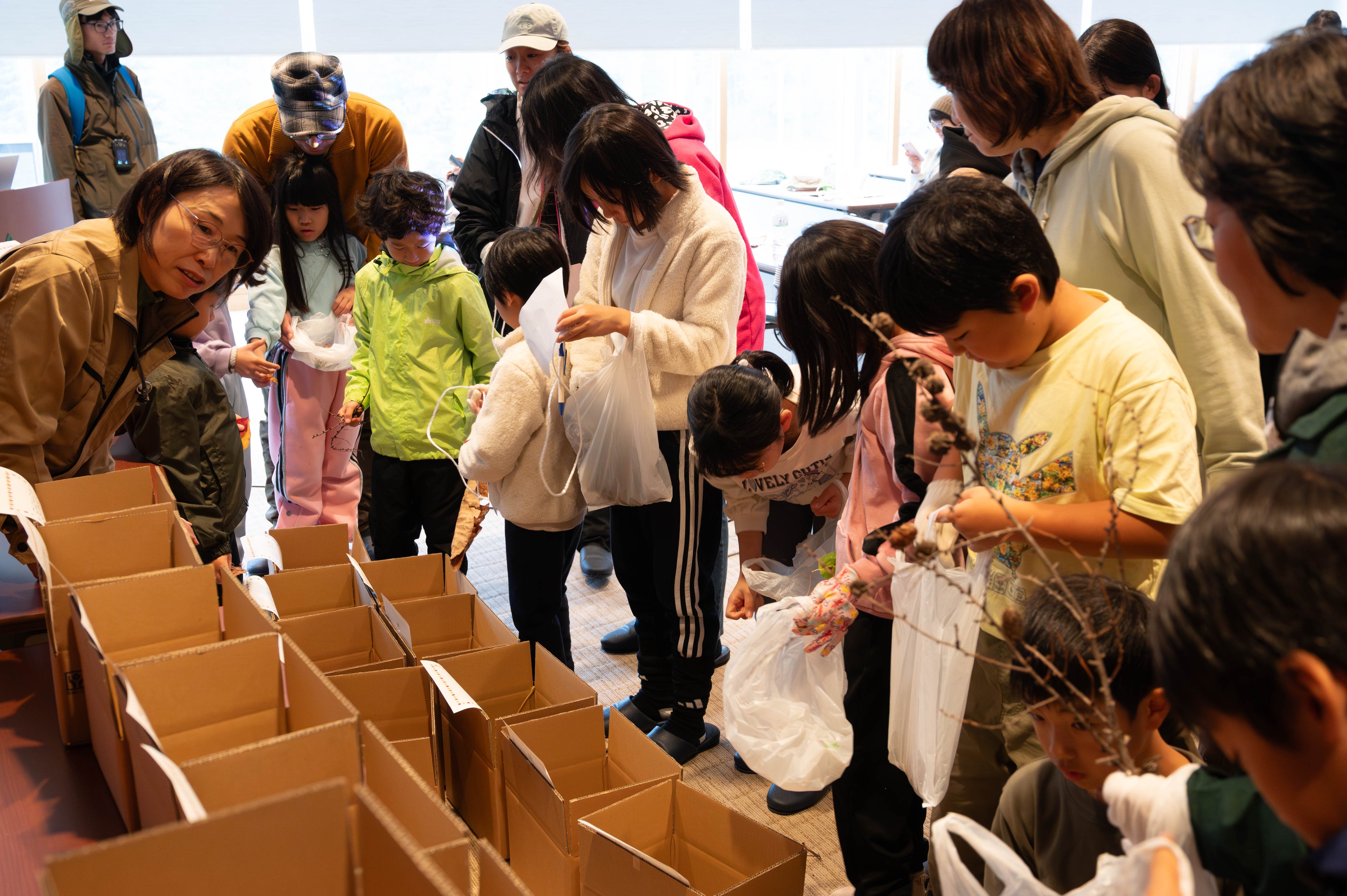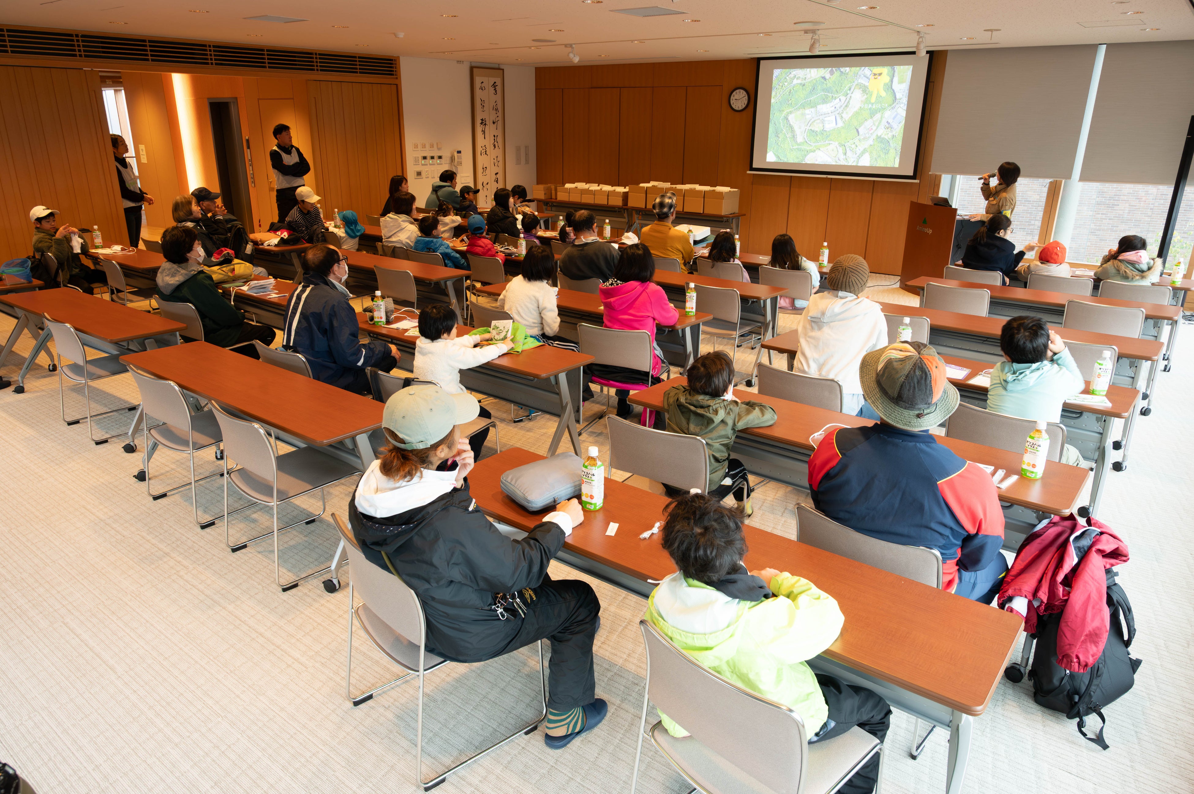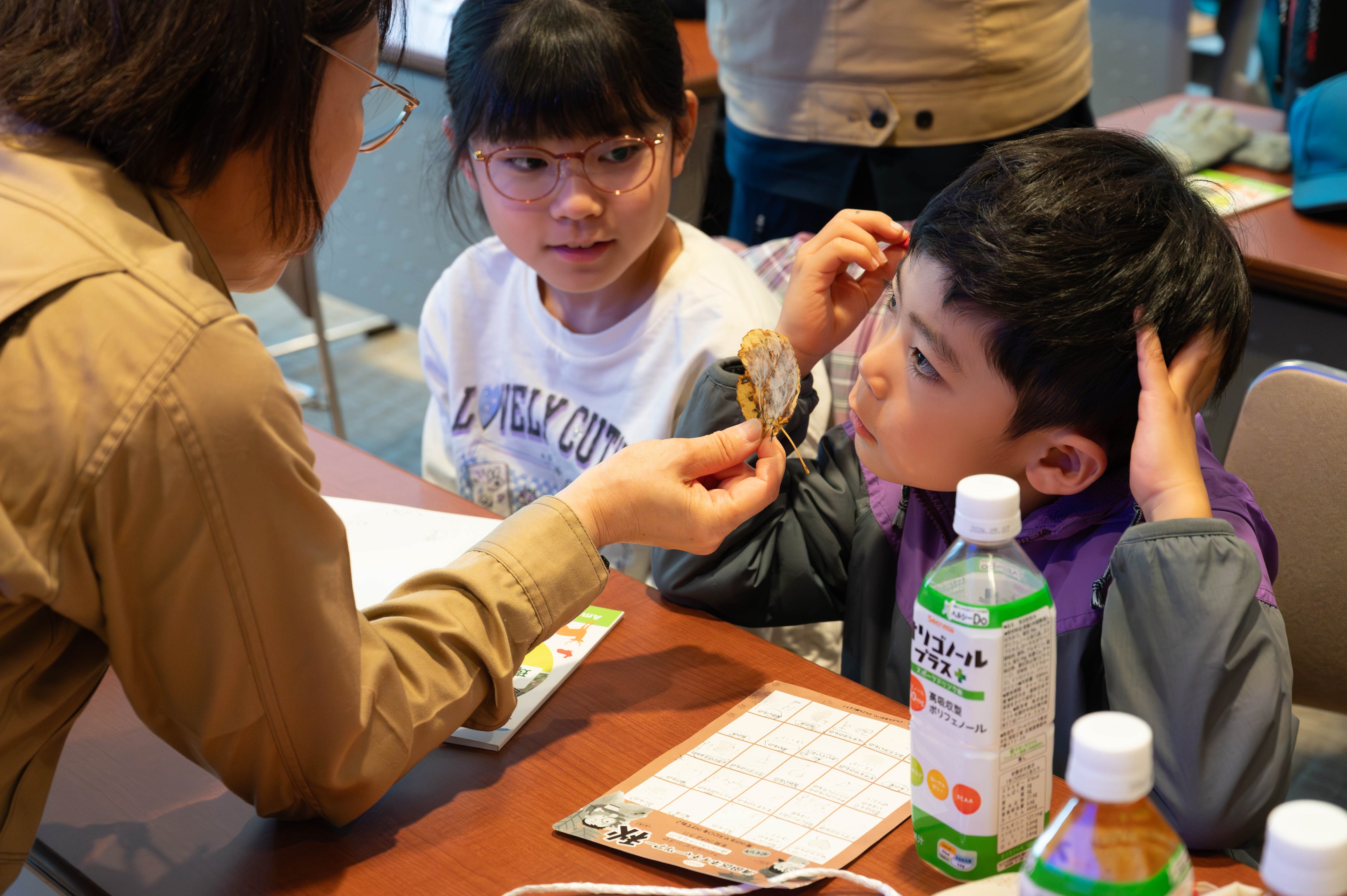 散策の後は社屋へ戻り、持ち帰ったものとビンゴのマスの答え合わせ。持ち帰ってきたものをガイドが一つずつ説明。「甘いにおいのする葉」や「フワフワしたススキの穂」などビンゴのマスと照らし合わせながら観察していきました。ガイドの解説には興味津々で聞き入り、大きく頷く参加者も多くいました。