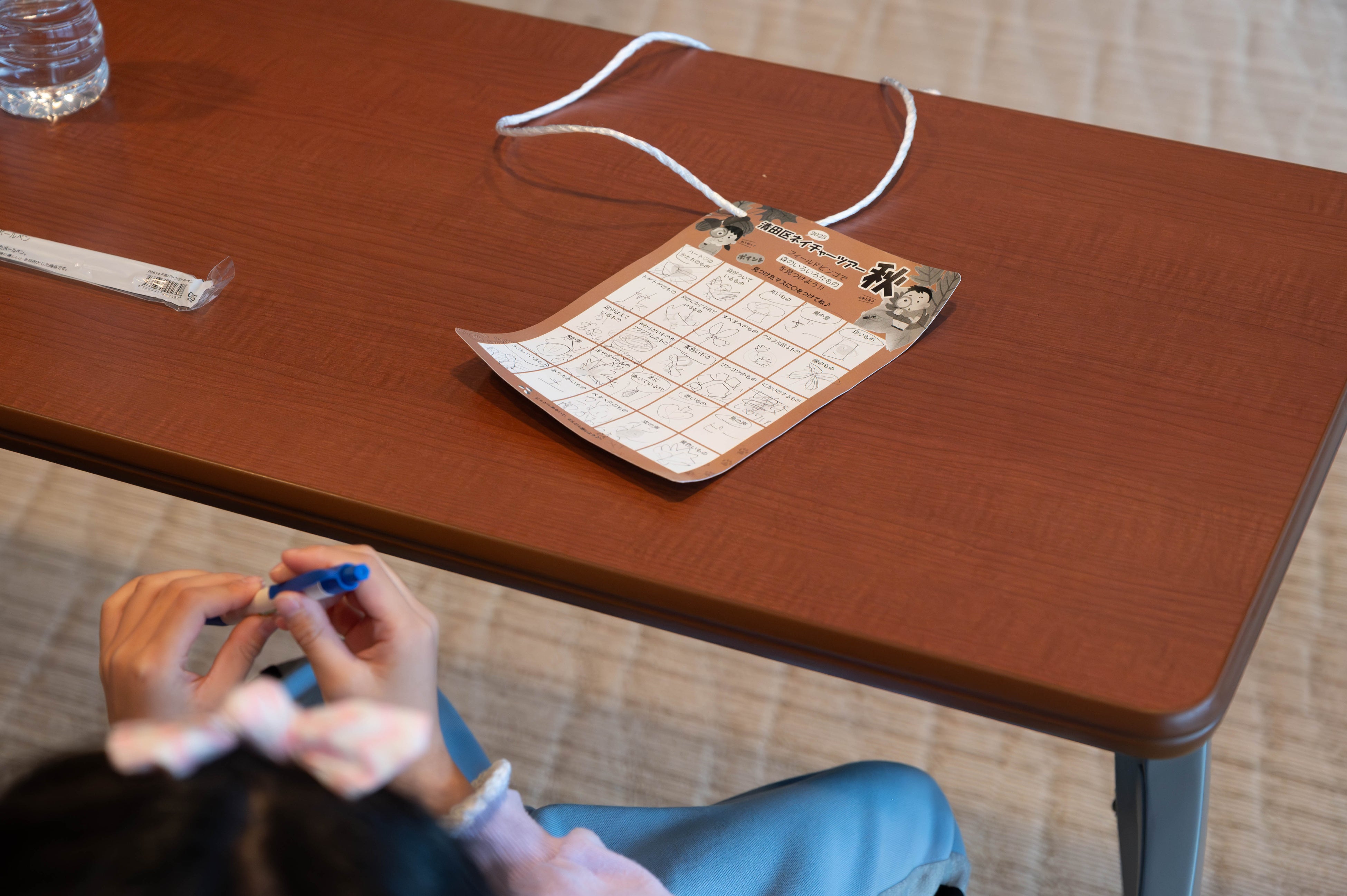 株式会社アミノアップに集合し、ビンゴカードが配られたあと、フィールドビンゴのレクチャーを受けました。フィールドビンゴとは、身近な自然をテーマに「見る・聴く・嗅ぐ・味わう・触れる」の五感全てを働かせて、自然の中にある様々なものを見つけ、ビンゴを完成させていくゲーム。今回は「味わう」を除く4つの感覚を働かせて見つけるビンゴカードを作成。見てわかるものだけでなく、「虫の声」、「あたたかいもの」、「ベタベタのもの」、「においのするもの」など想像を膨らませてもらうビンゴもマスも多数配置しました。