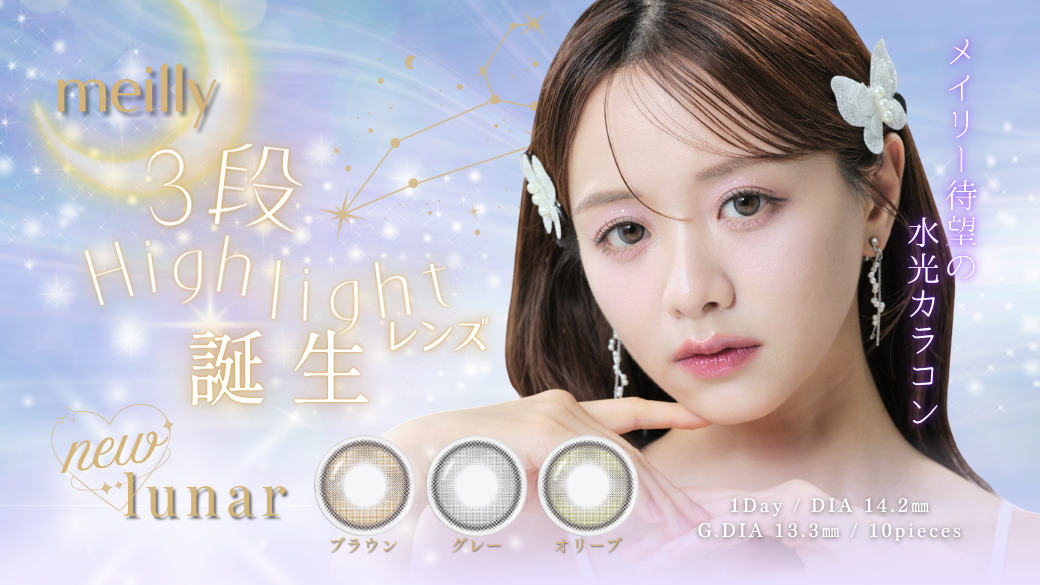 月や星のような繊細な輝きを瞳に映す「lunar(ルーナー)」は、優雅さと光の強さが共存する夜空をイメージして誕生したmeilly待望の水光カラコンです。
