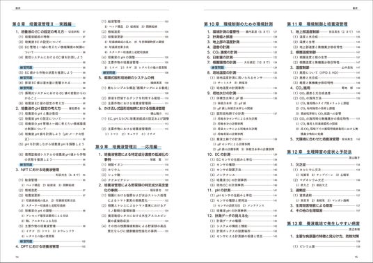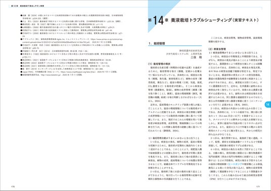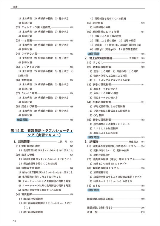 養液栽培とは何かから始まり、主要様式と特性、養液栽培に用いる用水、培養液の基礎、培養液の管理に関する基礎と応用、環境制御のための環境計測、発生しやすい病害の話、コストと内訳、様々なトラブルシューティングなどの詳細をまとめています。
