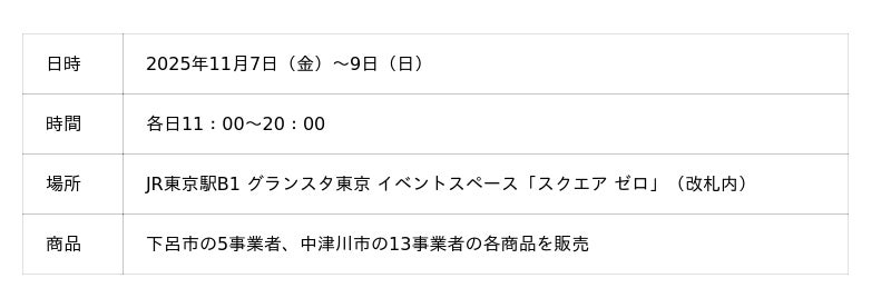 近い将来、リニア中央新幹線の岐阜県駅が中津川市に設置され、品川~中津川間が約60分で結ばれることで、首都圏からのアクセスが飛躍的に向上します。この新たな時代の到来を見据え、中津川市と、そこから車で1時間と好アクセスな温泉地・下呂市が連携し、”おいしいもの”をきっかけに両市の魅力を発信する観光物産展を実施します。