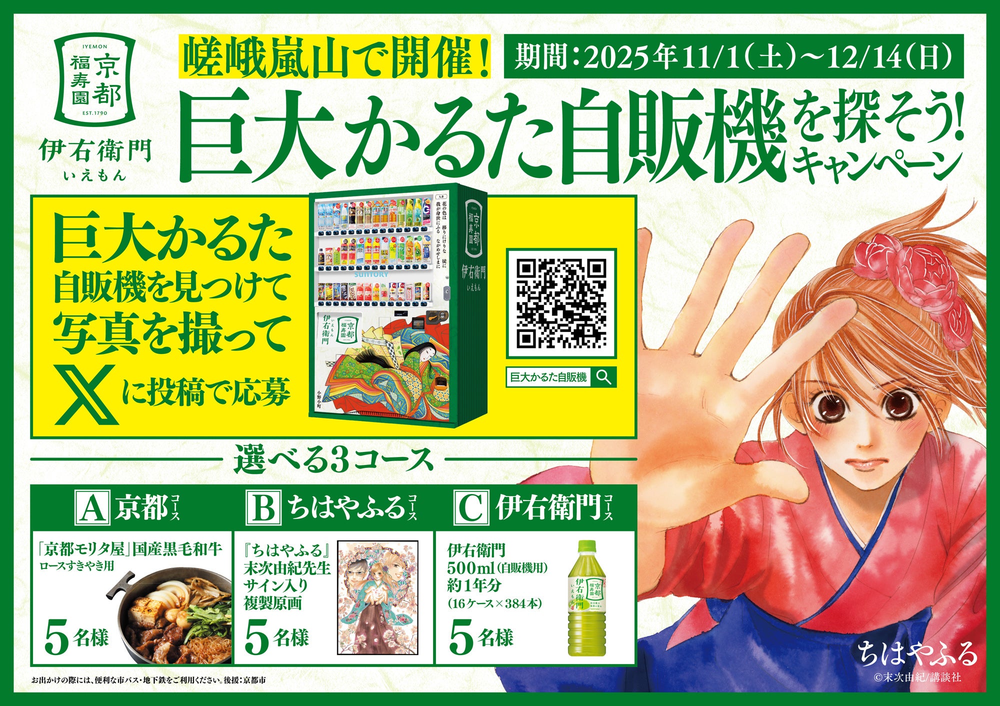 各所に設置された、百人一首の句が書かれた巨大かるたデザインの自動販売機を見つけて写真撮影の上、Xにて投稿いただくと、抽選で豪華景品が当たります。また、レストラン嵐山などには、競技かるたを題材とした漫画『ちはやふる』のコミックスカバーイラストを元にした、特別デザインの自動販売機も登場します。ぜひご注目ください。
