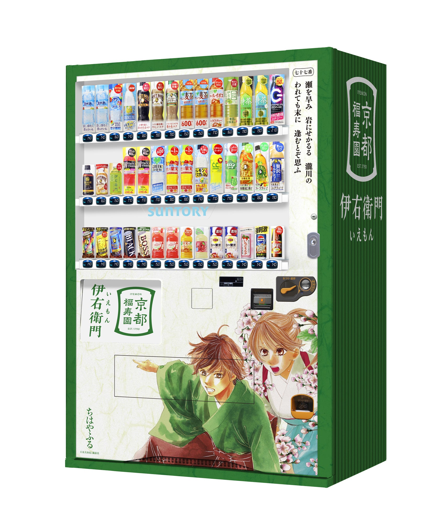 競技かるたを題材とした大ヒット漫画『ちはやふる』のコミックスカバーイラストを元にした、特別デザインの自動販売機です。