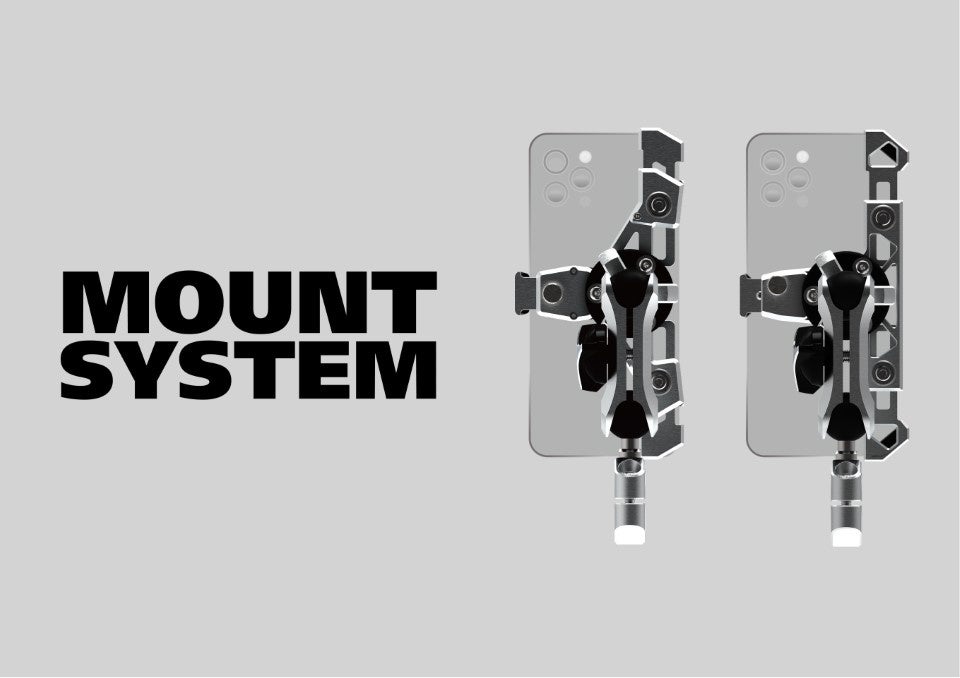 高強度オートバイ用スマートフォンホルダー「MOUNT SYSTEM」。 タフで、強く、美しい。研ぎ澄まされた機能美を持つ、「アルミ削り出し」オートバイ専用スマートフォンホルダー。