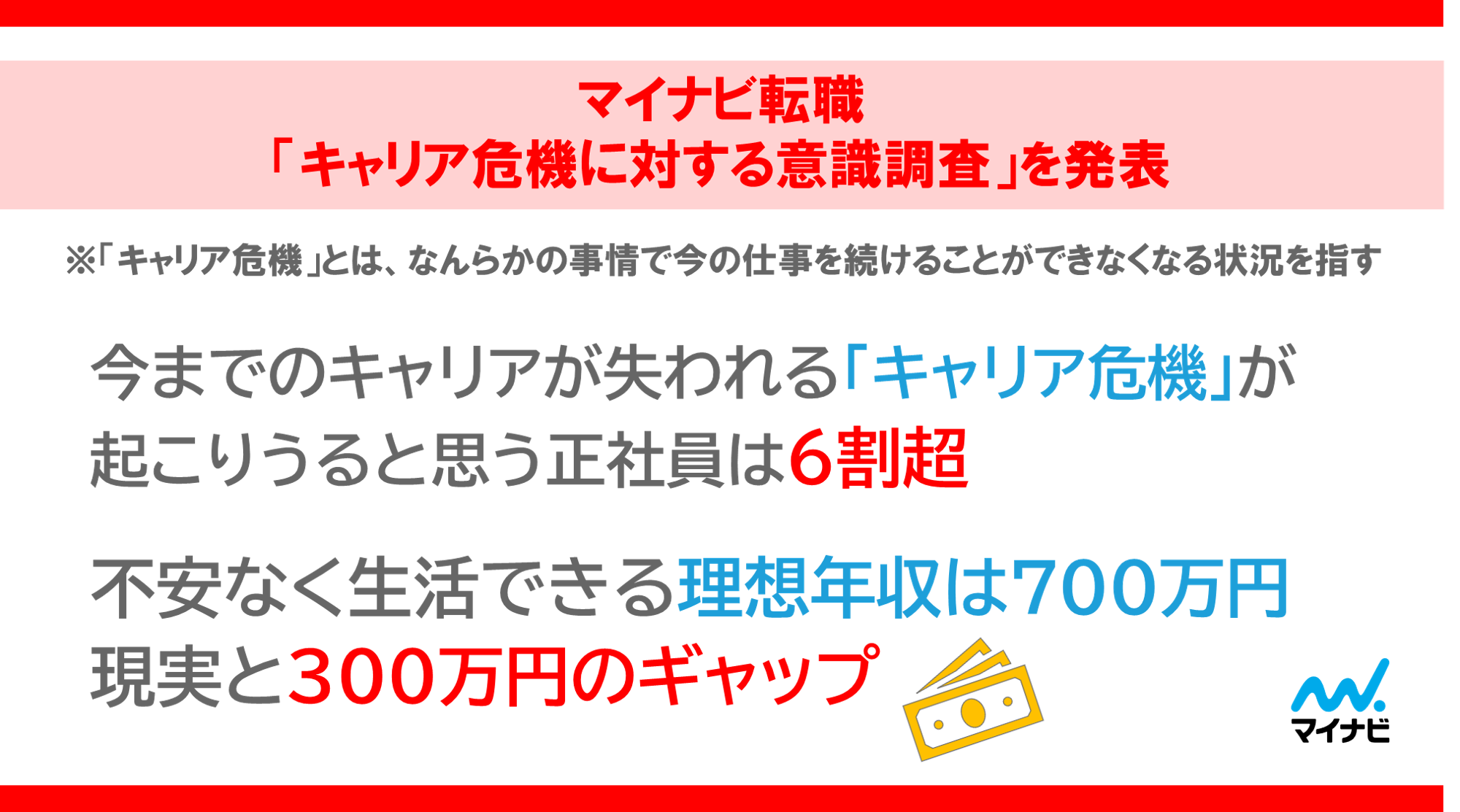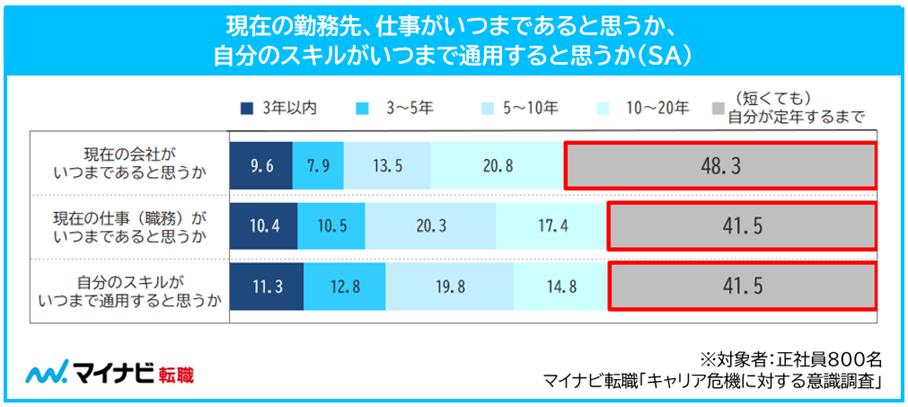 株式会社マイナビ(本社:東京都千代田区、代表取締役 社長執行役員:土屋芳明)が運営する総合転職情報サイト『マイナビ転職』(https://tenshoku.mynavi.jp/)は、正社員800名を対象に行った「キャリア危機に対する意識調査」の結果を発表しました。