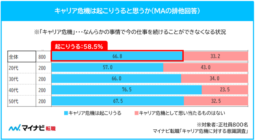 正社員のうち、なんらかの事情で今の仕事を続けることができなくなる「キャリア危機」が起こりうると感じている人は全体で66. 8%だった。