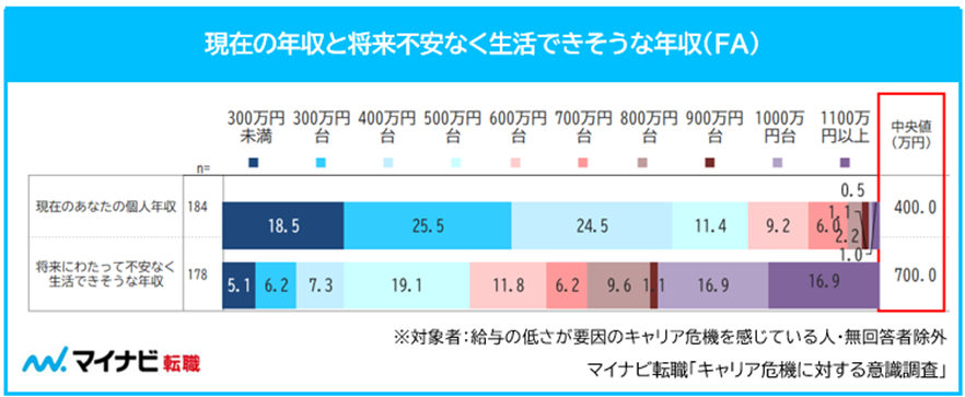 一方、将来不安なく生活できそうな年収を聞くと、中央値は700万円となり現実と300万円のギャップがあることがわかった。