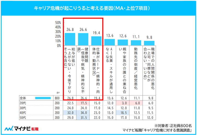 ◆キャリア危機が起こりうる要因は、「給与が低い」「健康問題」「仕事がハード」がトップ