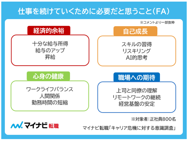 さまざまなキャリア危機意識を持つなかで、安定して仕事を続けていくために必要なものを聞いたところ、「十分な給与所得」「昇給」などの経済的安定、「スキルの習得」「AI的思考」などの自己成長、「ワーク・ライフ・バランス」「人間関係」などの心身の健康に関する意見が多く見られた。