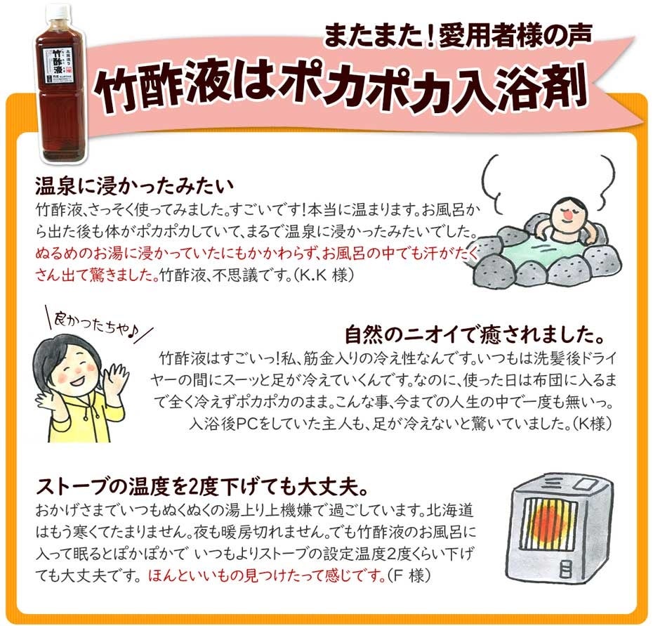スキンケアに気をつかう方にもおすすめで、お客様からは「お風呂上がりに体が温かく感じられた」、また竹酢液を入れたお湯を使って洗髪をしたところ「髪にしっとり感が出た」といったご感想も寄せられており、入浴の時間をさらに豊かにするアイテムとしてご好評をいただいています。