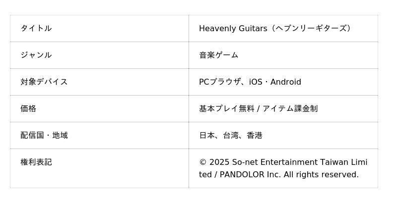 ソネットゲームスタジオ株式会社(所在地:東京都品川区、代表取締役社長:永田博丈)は、エレキギターにフォーカスした対戦型音楽ゲーム『Heavenly Guitars(ヘブンリーギターズ、以下本作)』の配信者ランキングイベント「『Heavenly Guitars』ギターフェスティバル2025」(以下、本フェスティバル)を開催することをお知らせいたします。本フェスティバルは、配信者の動画の盛り上がりや影響力を総合的に評価する配信イベントです。