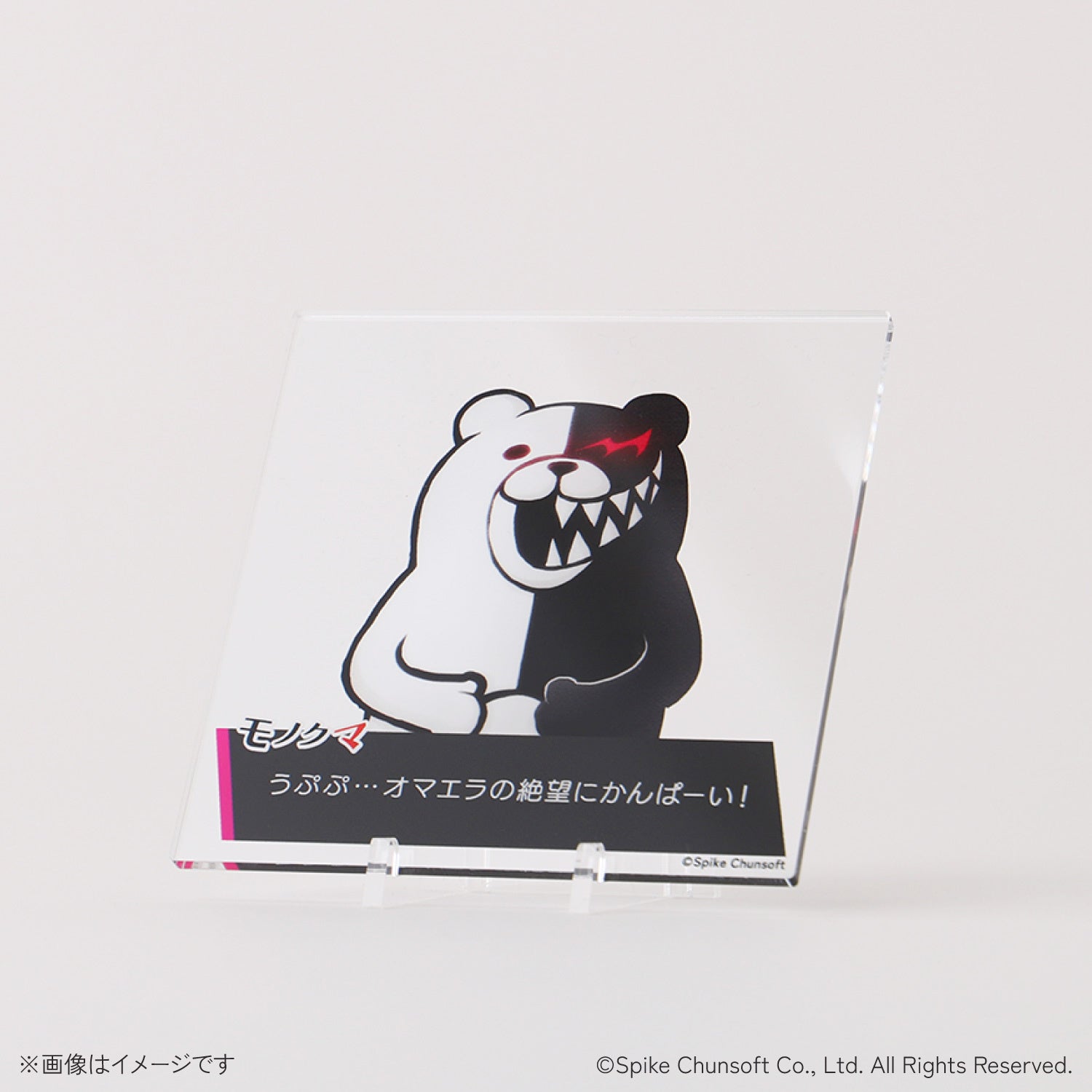 モノクマのセリフが入ったオリジナルデザインのアクリルコースターです。コースターの背景が透明なので置く場所によって見え方が変わり、モノクマをさまざまなところに出現させて楽しめます。