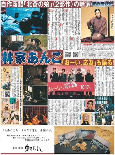 スポーツ報知を発行する報知新聞社(代表取締役社長・長谷川剛)は、東京本社のある東京・墨田区などを中心に無料で配置・配布している地域コミュニティー季刊紙「すみだ報知」の特別号(オールカラー、ブランケット判2ページ)を部数限定で発行しました。すみだの歴史的偉人、葛飾北斎の娘を描いた映画『おーい、応為』を特集。江戸時代を代表する浮世絵師・葛飾北斎の弟子で娘だった葛飾応為の生きざまなど描いた長澤まさみ主演の公開映画の、10月18日に「TOHOシネマズ錦糸町 楽天地」で行われた公開記念舞台挨拶の様子を独占リポート。 その一部を紙上再録したほか、自作落語「北斎の娘」を手掛ける墨田区生まれ墨田区育ちの女流落語家・林家あんこによる映画のみどころや北斎役の永瀬正敏への質問なども掲載しています。