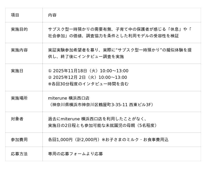 実施日は2025年11月18日(火)および12月2日(火)の2日間、ビーフィニティが運営する一時預かり託児所「miterune 横浜西口店」にて一時預かりを行います。
