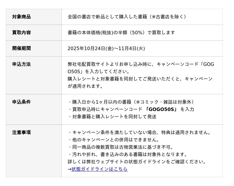 日本全国で続く「街の本屋さん」の減少と書店文化の縮小に歯止めをかけるため、宅配買取サービスを展開する株式会社ブックサプライ(本社:大阪府吹田市、代表:藪田真吾)は、「本は本屋で買おう!」のコンセプトをもとに、購入した書籍を“本体価格の半額”で買取するキャンペーンを実施します。