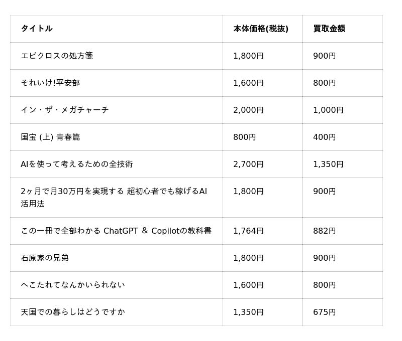 3.半額で買取購入された書籍の本体価格の半額で買取金額を還元いたします