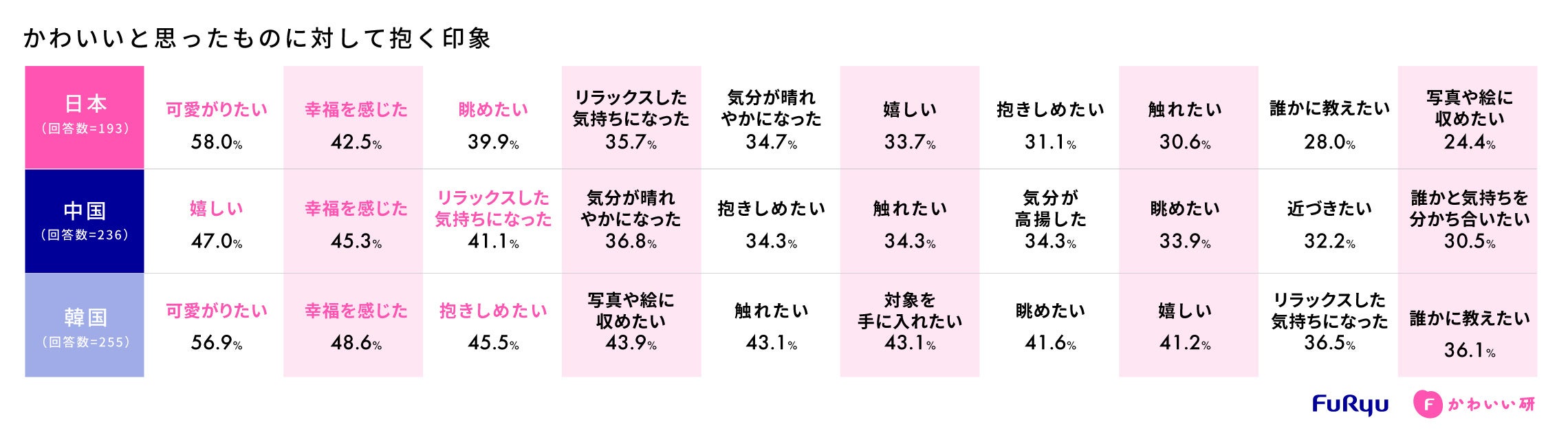 『フリューかわいい研究所』_「“かわいい”と思ったものに対してどんな印象を抱くか」に関する日本・中国・韓国での調査結果