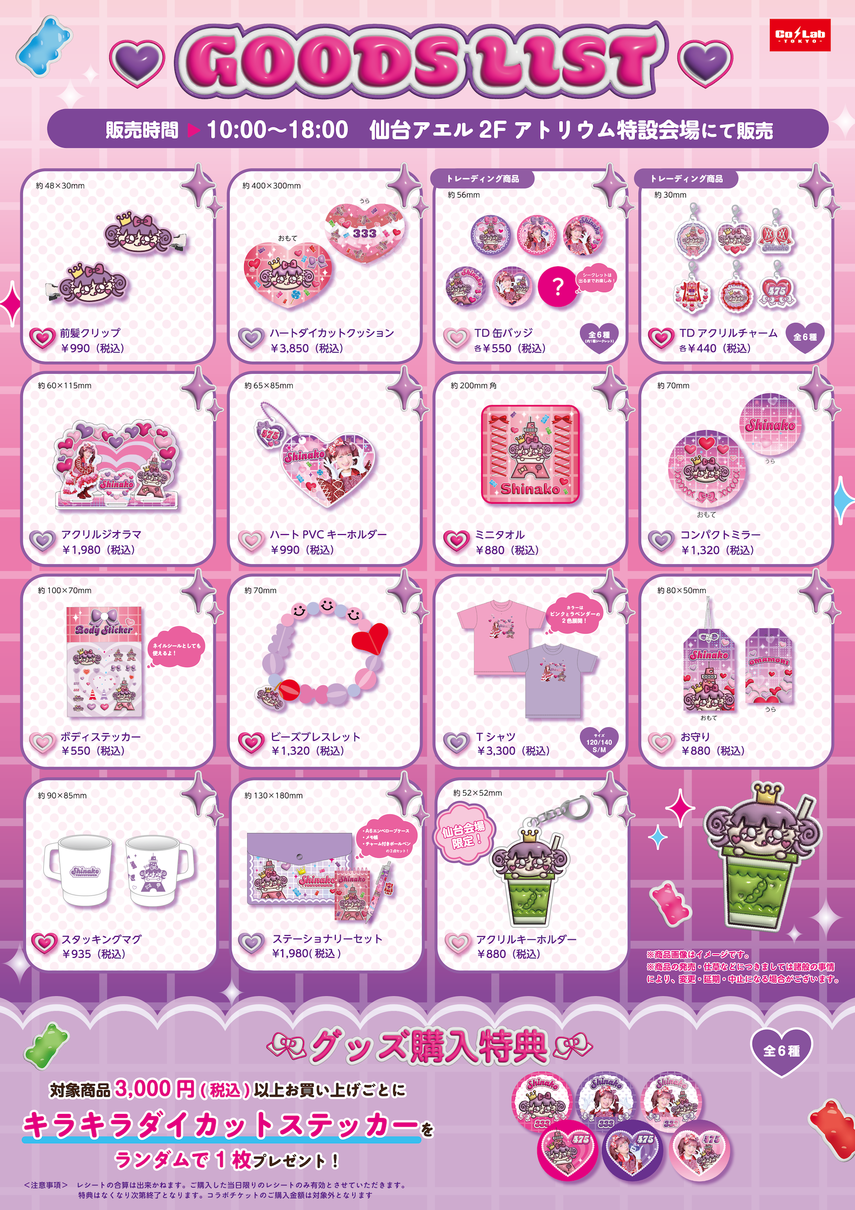 AER仙台2F「アトリウム特設会場」では、しなこの撮り下ろされた写真と新規イラストを使用した限定コラボグッズを販売致します。(全15アイテム25種類)本イベントでしか手に入らないエリア限定デザインのグッズも販売いたします。開催期間中は1会計3,000円(税込)ご購入毎に、【キラキラ大カットステッカー】1枚をプレゼントいたします。