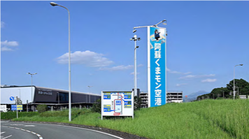 空港入口看板や旅客ターミナルビル外壁のくまモン装飾が阿蘇くまもと空港を訪れる方々を出迎えます。このほか、階段や床面などもシートで飾り付け、写真映えするフォトスポットも設置します。