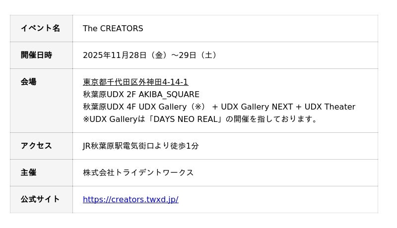 『The CREATORS』は11/28(金)~29(土)の2日間にて開催となりますので、