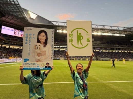 特設ステージでの「健康ダンスチャレンジ」や、ハーフタイムでのグリーティングを通じ、体を動かす楽しさと、日々の生活における“健康意識”の重要性をスタジアム全体に発信しました。