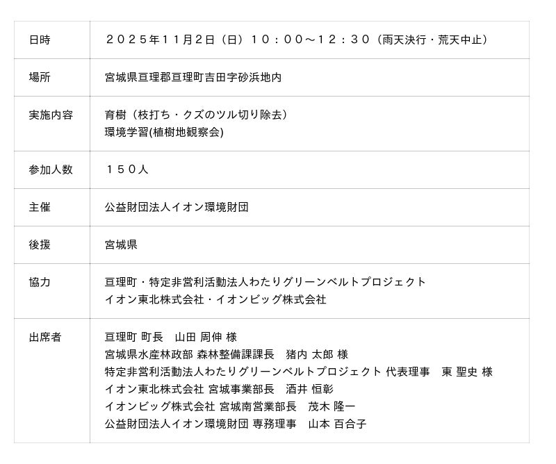 公益財団法人イオン環境財団(理事長 岡田元也 イオン株式会社取締役兼代表執行役会長 以下当財団)は、11月2日(日)に「宮城県亘理町育樹」を実施します。
