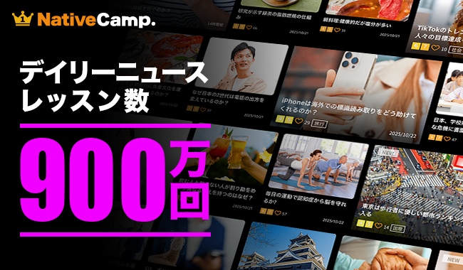 ネイティブスピーカーと回数無制限のオンライン英会話サービス「ネイティブキャンプ英会話」を展開する株式会社ネイティブキャンプ(東京都渋谷区 代表取締役:谷川国洋)は、2025年10月24日(金)、一番人気のオリジナル教材「デイリーニュース」が累計900万レッスンを達成したことをお知らせいたします。