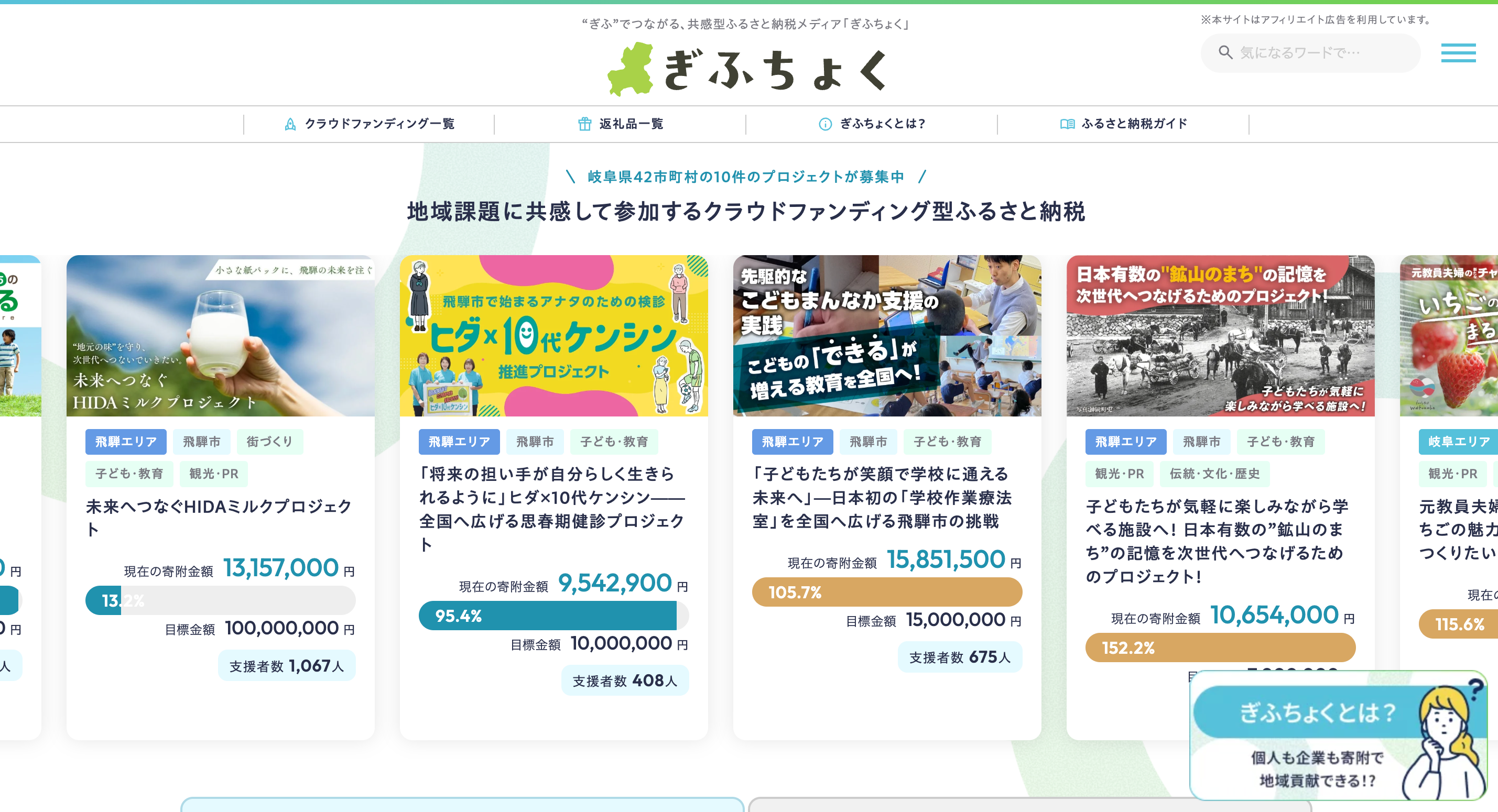 サイトの特徴:ぎふちょくは2024年10月に開設され、2025年10月にリニューアル公開されました。リニューアルでは、岐阜県内全42自治体の返礼品情報を網羅し、シビック・クラウドファンディング情報やガバメントクラウドファンディングのプロジェクトも掲載するなど、岐阜県のふるさと納税情報をまとめて提供しています。
