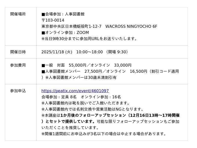 人事図書館主催にて、人事のプロたちが実践している内容である「知る」「仕事のすすめ方」「人事の課題解決」の3テーマを1日かけてしっかりと学ぶ、フォローアップセッション付き講座を開催いたします。